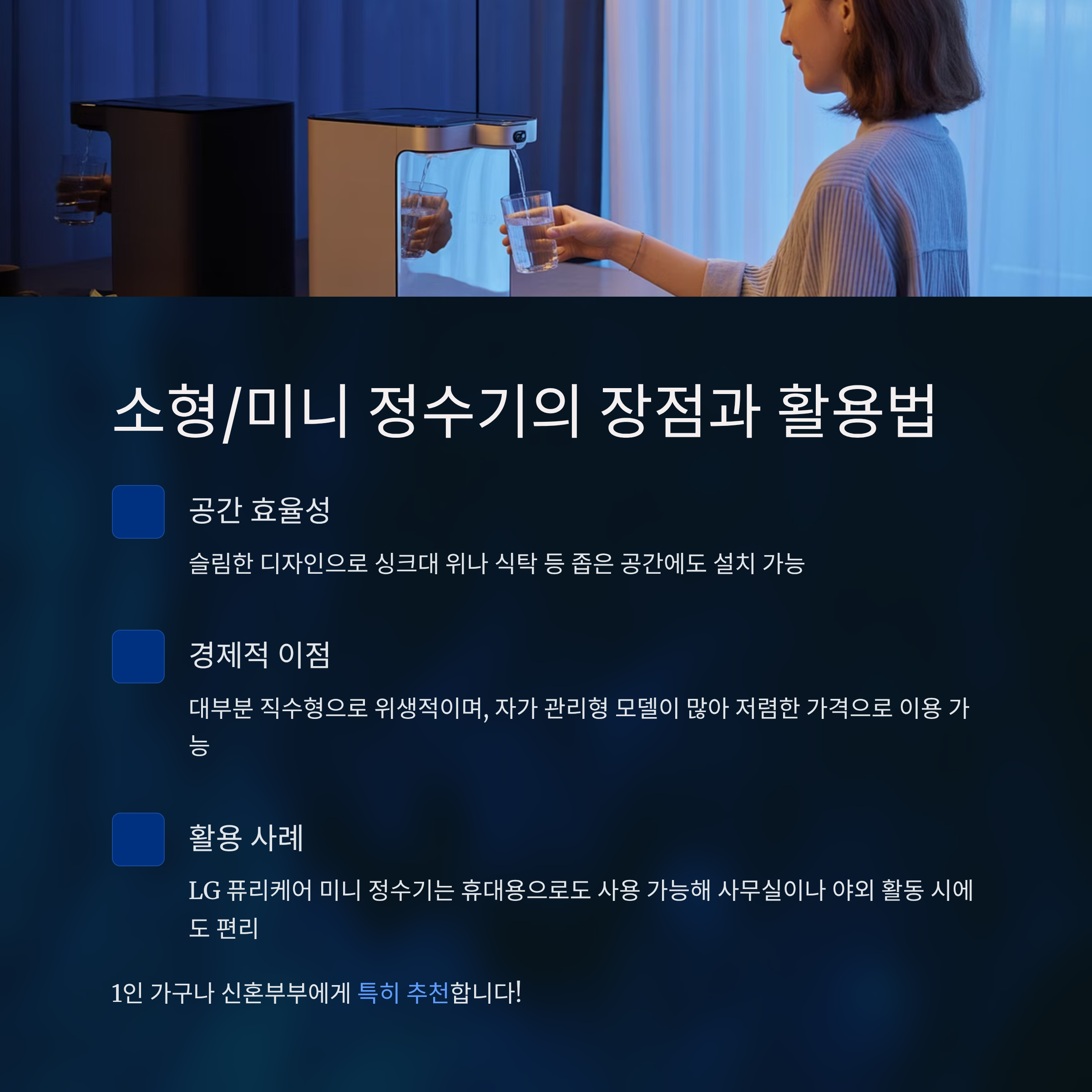 | 가족 수 | 1~2인 가구: 소형, 미니 정수기 | 공간 활용이 중요한 가구에 적합하며, 슬림한 디자인이 특징이에요. |