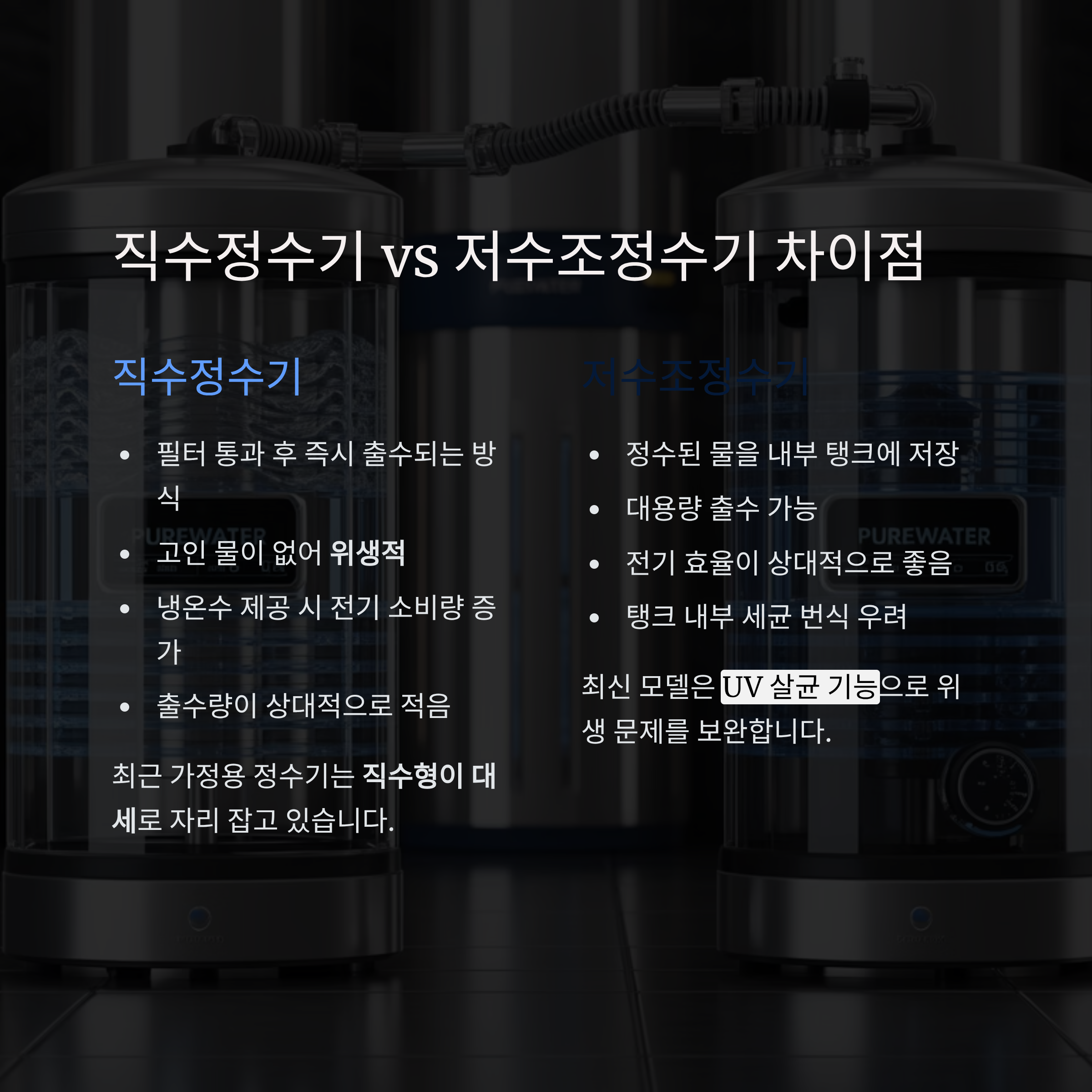 - 최근 가정용 정수기는 대부분 직수형이 대세로 자리 잡고 있습니다.