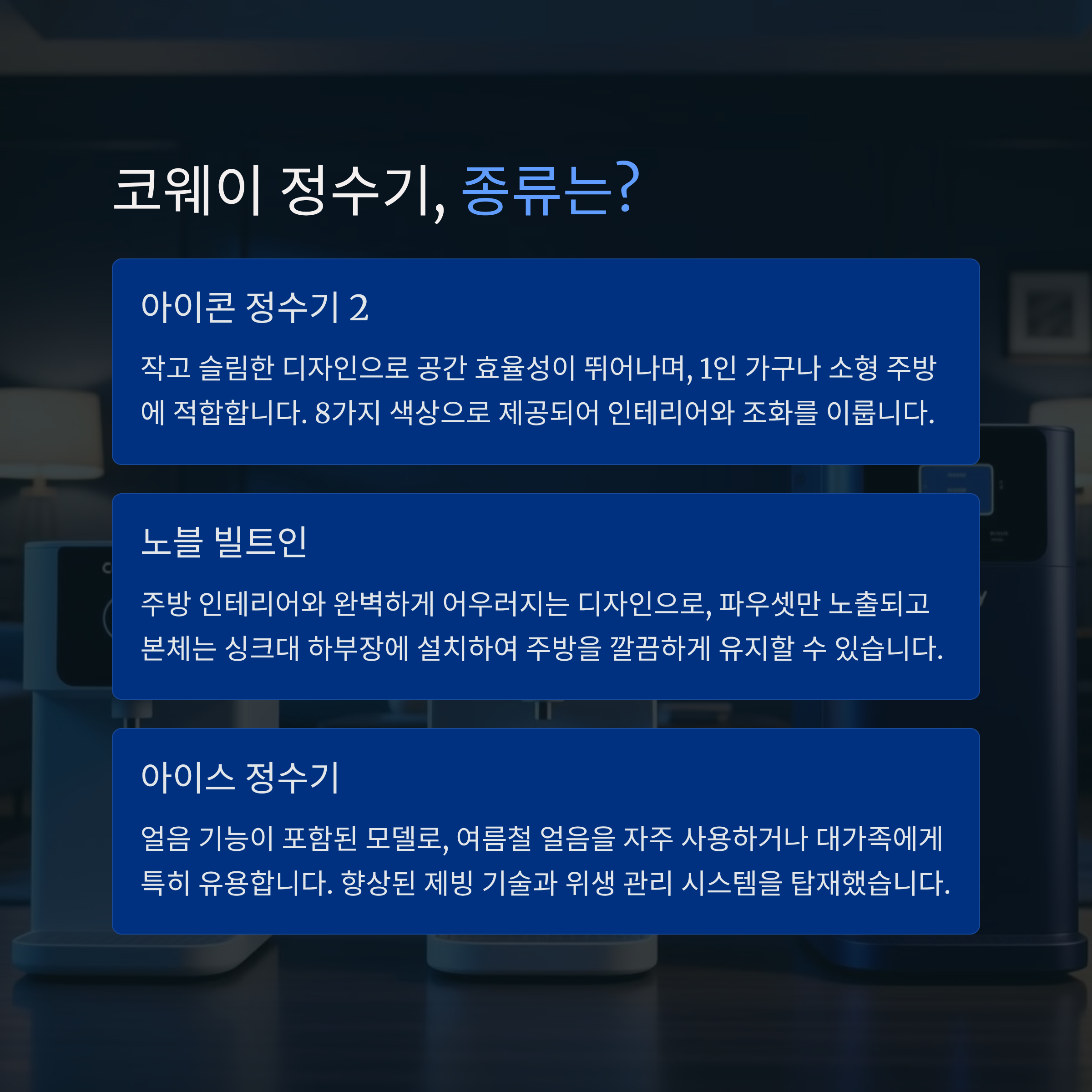 코웨이의 정수기 라인업은 크게 아이콘, 노블, 아이스로 나눌 수 있어요. 먼저, 아이콘 정수기 2는 작고 슬림한 디자인으로 공간 효율성이 뛰어나요.