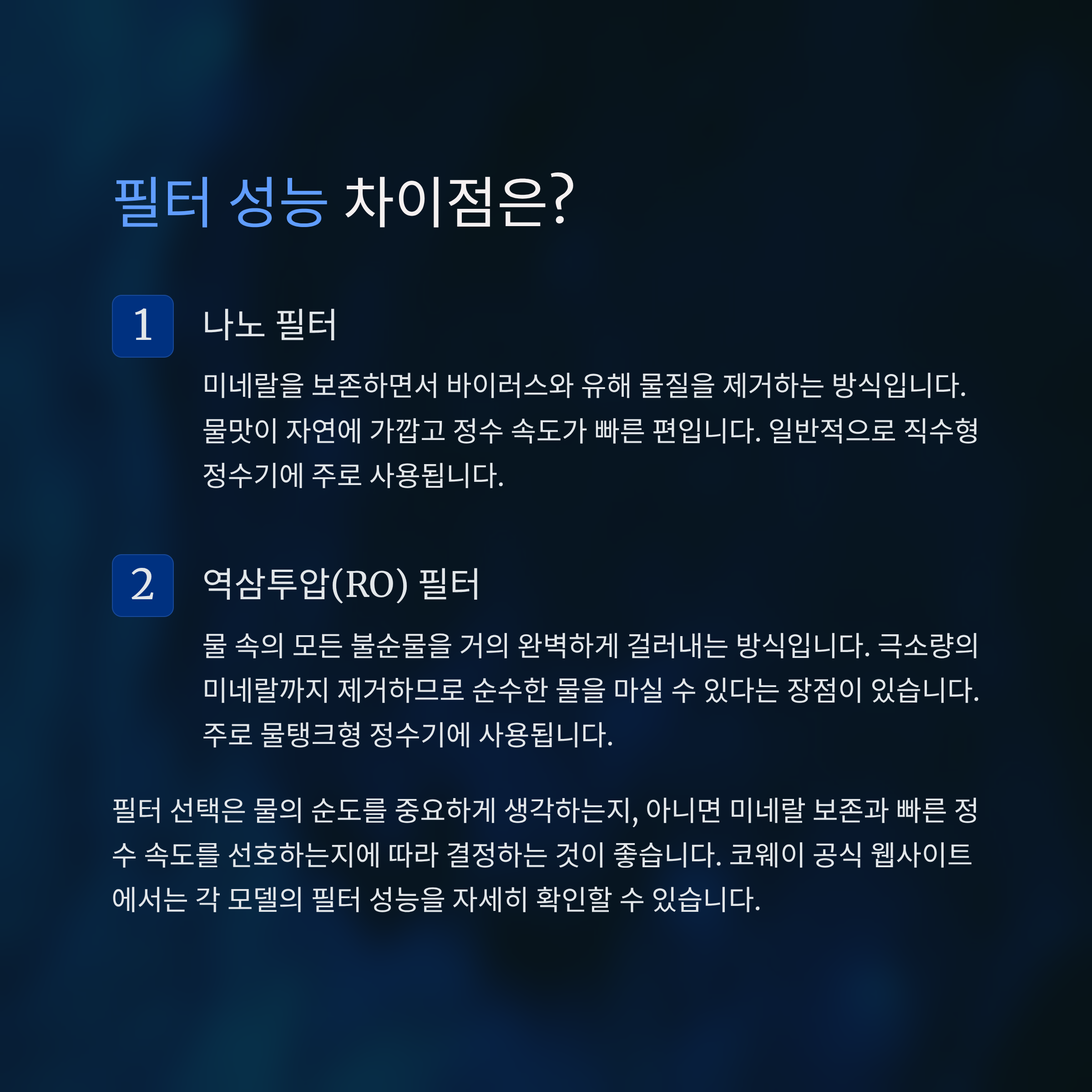 정수기의 핵심은 역시 필터 성능이죠. 코웨이 정수기는 크게 나노 필터와 역삼투압(RO) 필터를 사용해요. 나노 필터는 미네랄을 보존하면서 바이러스와 유해 물질을 제거하는 방식이에요.
