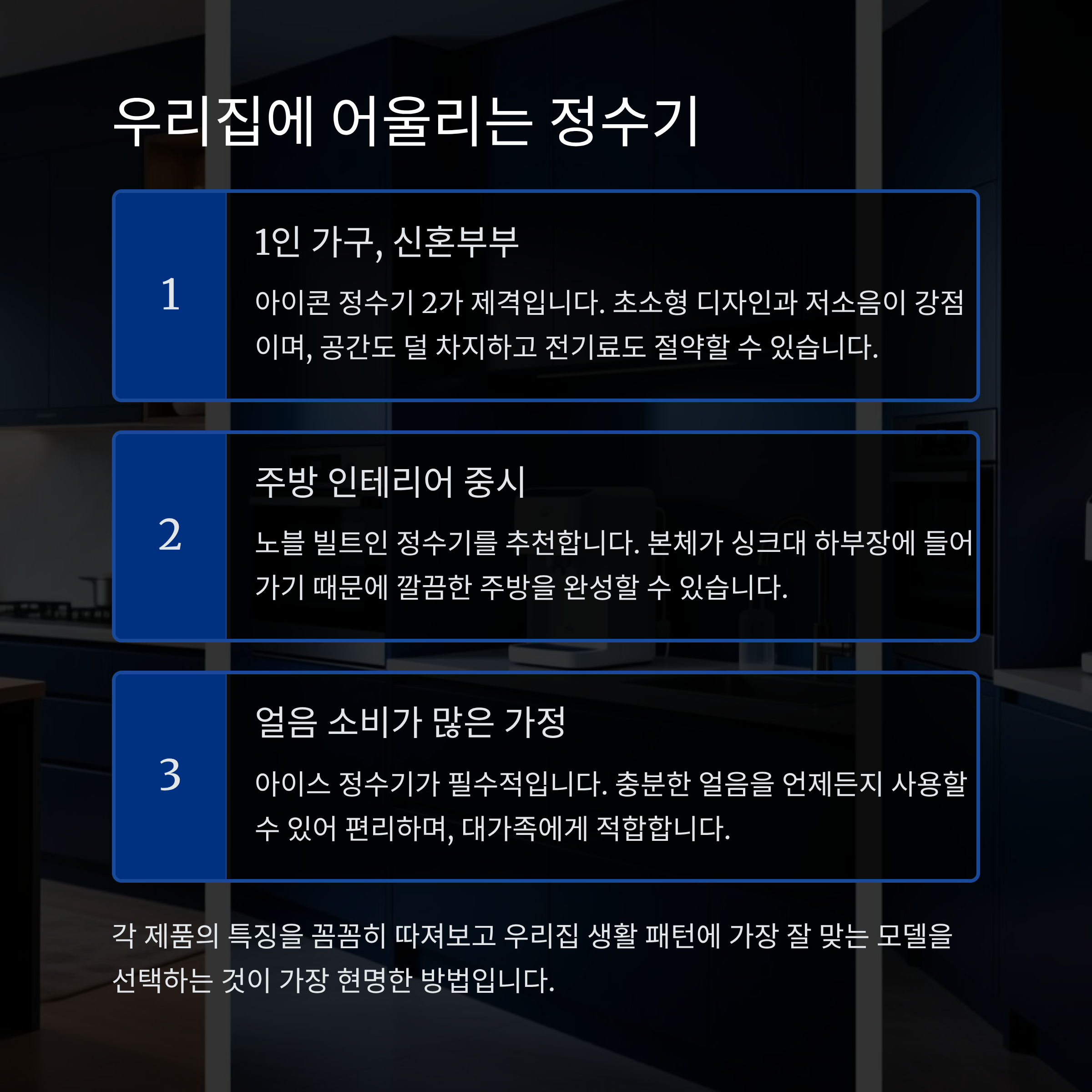 내 라이프스타일에 맞는 정수기를 찾는 것이 가장 중요해요. 1인 가구나 소규모 가정이라면 초소형 디자인과 저소음이 강점인 아이콘 정수기 2가 제격이에요.